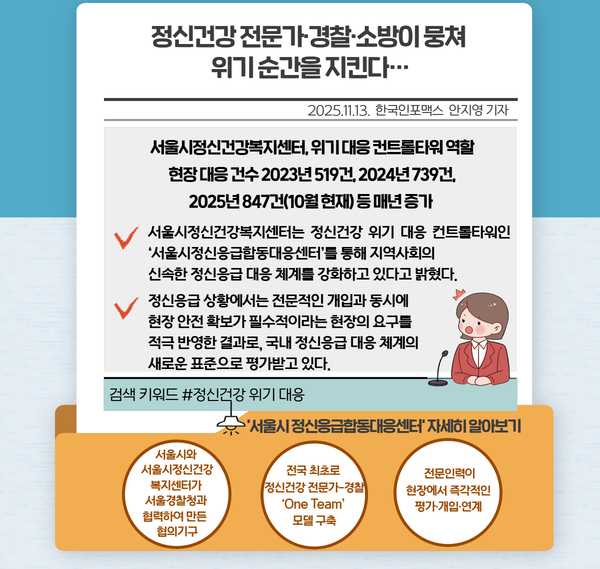 1. 정신건강 전문가·경찰·소방이 뭉쳐 위기 순간을 지킨다… 야간·휴일 위기 대응 최전선 ‘서울시정신응급합동대응센터’_한국인포맥스_2025.11.13_안지영 기자-서울시정신건강복지센터는 정신건강 위기 대응 컨트롤타워인 ‘서울시정신응급합동대응센터’를 통해 지역사회의 신속한 정신응급 대응 체계를 강화