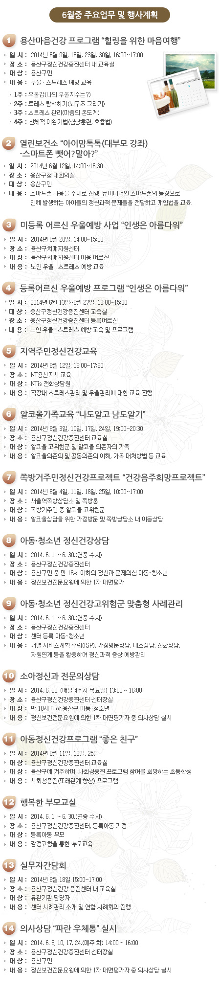 용산구정신건강증진센터 6월 일정입니다.