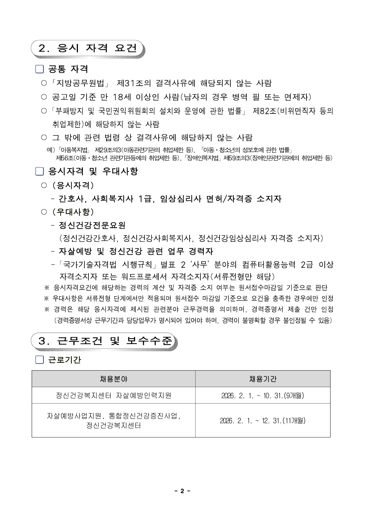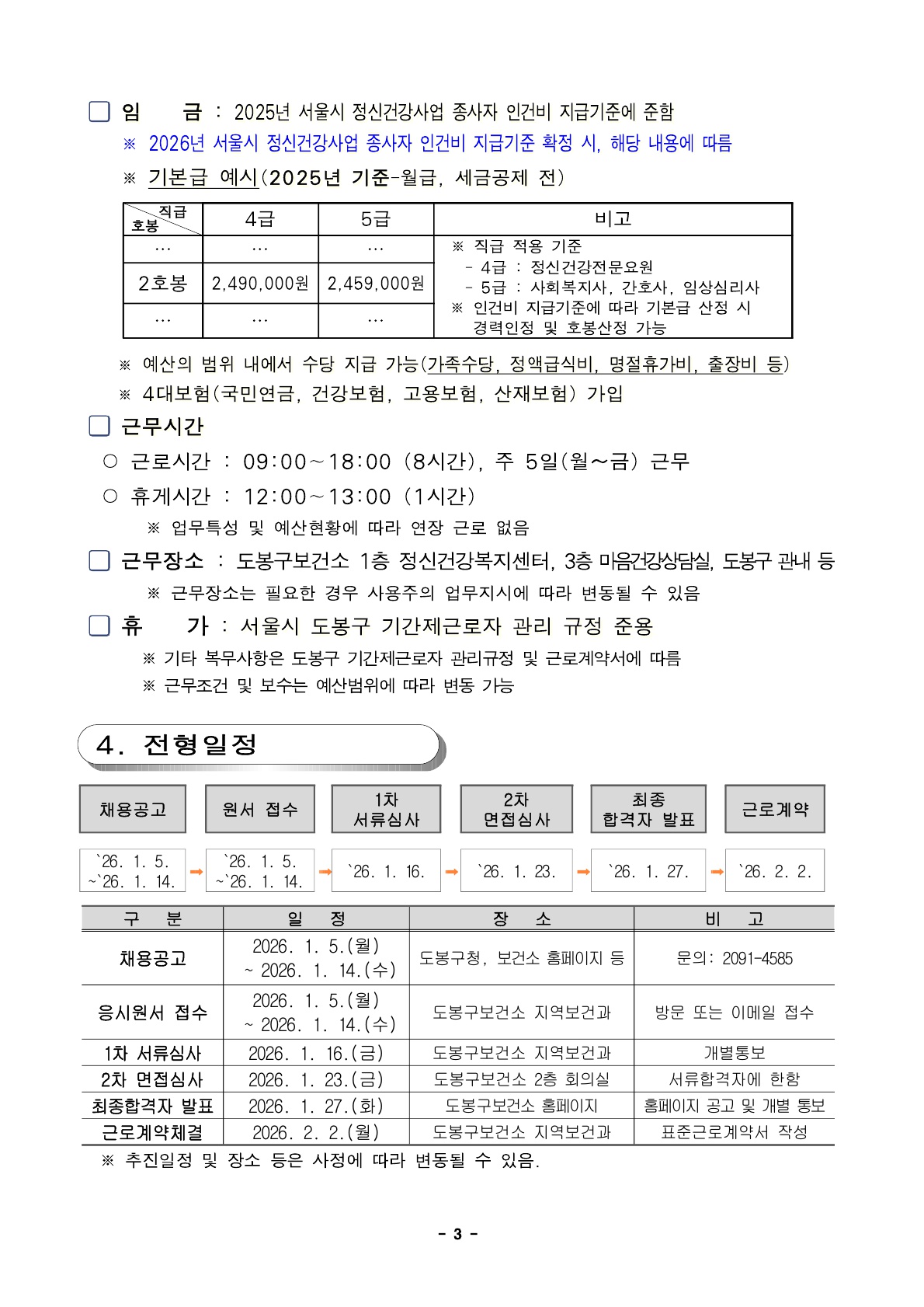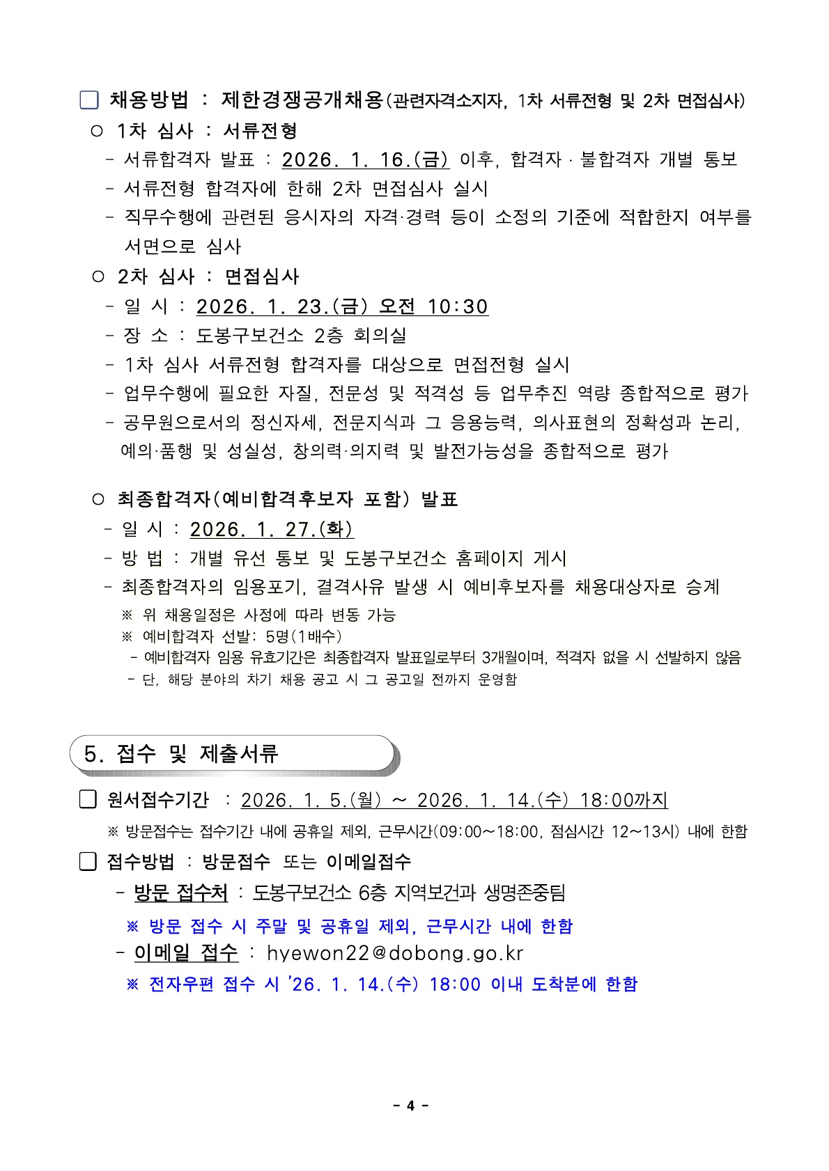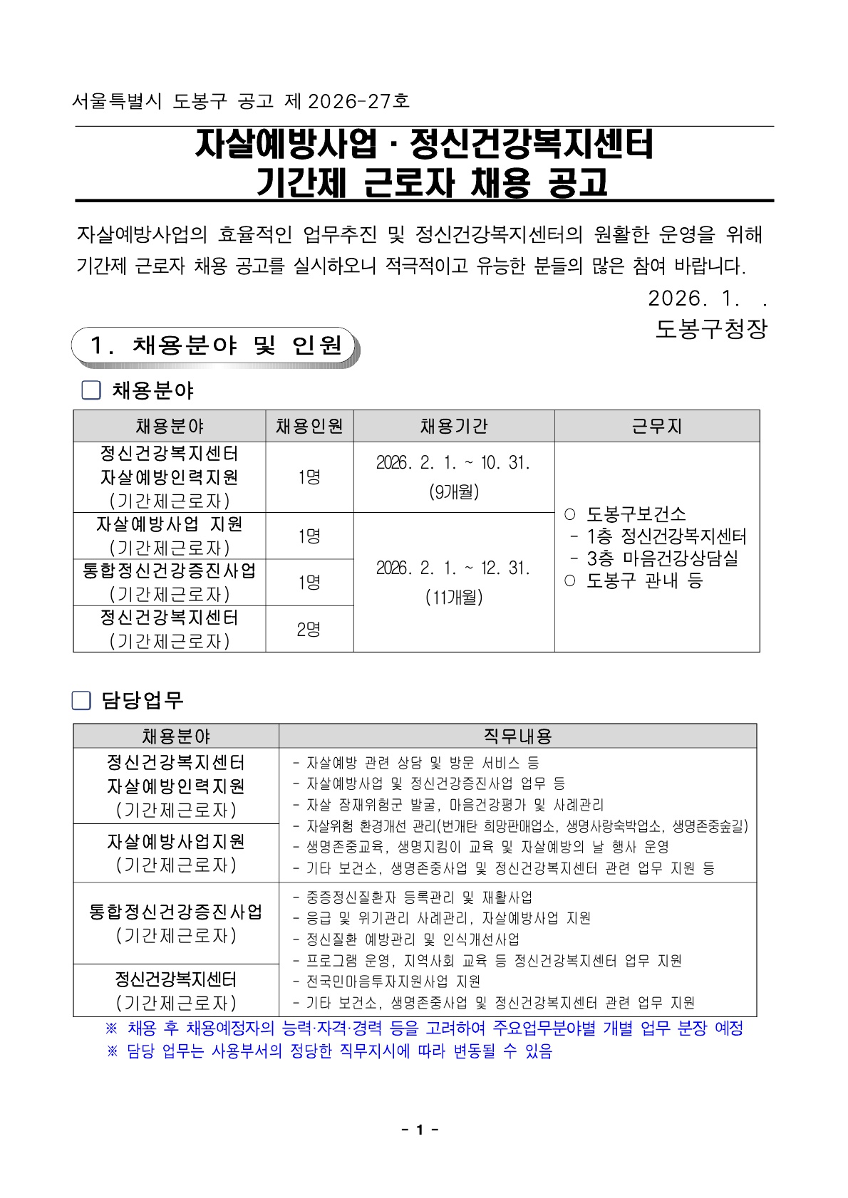자살예방사업·정신건강복지센터 기간제근로자 채용계획을 아래와 같이 공고합니다. 1. 채용개요 ○ 채용분야 : 자살예방사업·정신건강복지센터 기간제근로자 ○ 계약기간 - 정신건강복지센터 자살예방인력지원: 2026. 2. 1. ~ 2026. 10. 31.(9개월) - 자살예방사업지원, 통합정신건강증진사업, 정신건강복지센터: 2026. 2. 1. ~ 2026. 12. 31.(11개월) ○ 채용직급 및 인원 : 기간제 근로자, 5명 2. 공고기간 : 2026. 1. 5.(월) ~ 2026. 1 .14.(수) 3. 접수기간 : 2026. 1. 5.(월) ~ 2026. 1 .14.(수) * 토요일 및 공휴일 방문접수 불가 4. 접수방법 : 방문접수 또는 이메일 접수(hyewon22@dobong.go.kr) 5. 접수장소 : 도봉구보건소 6층 지역보건과 생명존중팀[서울특별시 도봉구 방학로3길 117(쌍문동)] ※ 응시원서 등 양식은 도봉구 홈페이지 공고문에 첨부된 양식을 출력하여 사용 6. 기타 자세한 사항은 '붙임' 채용공고문 참조
