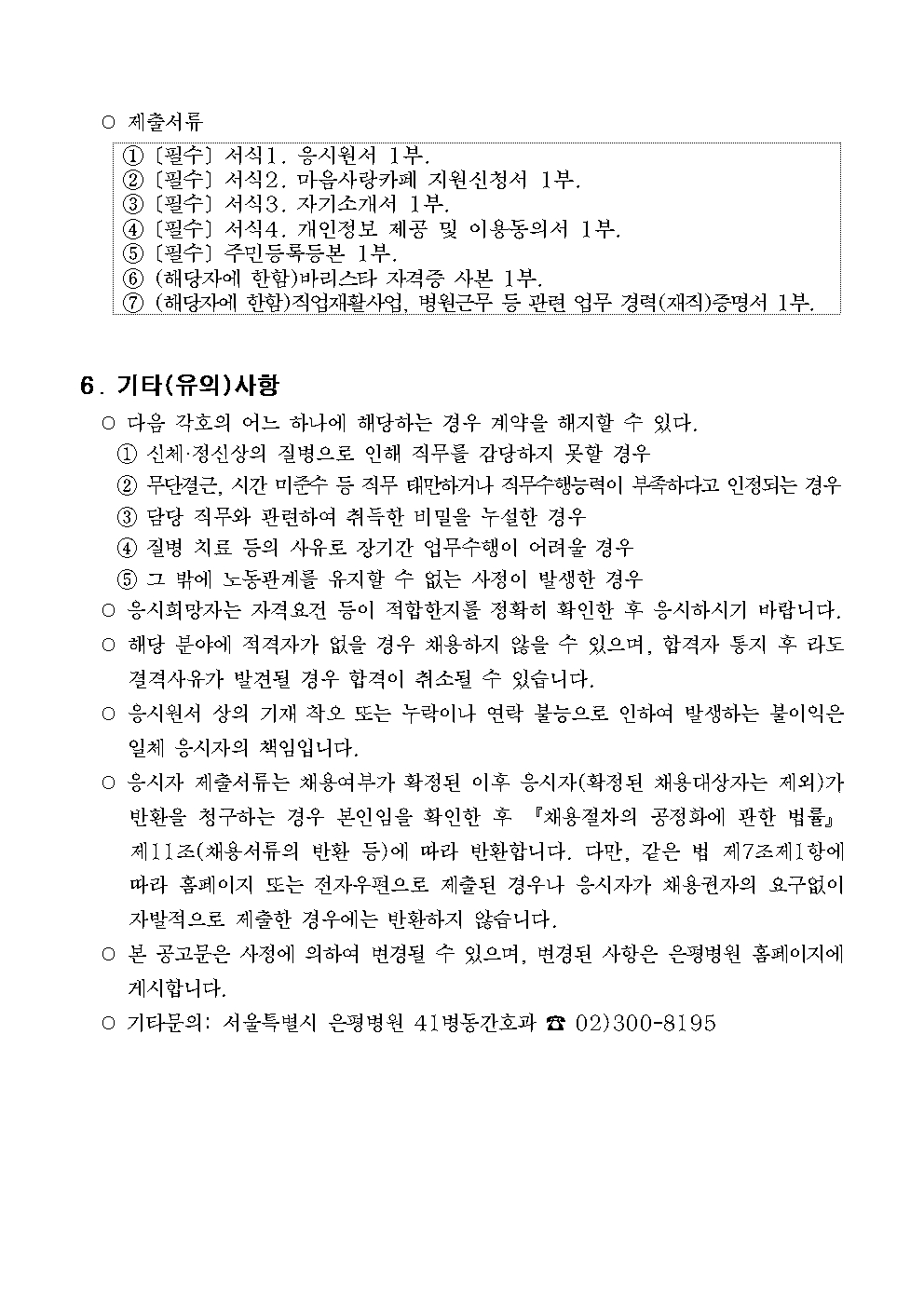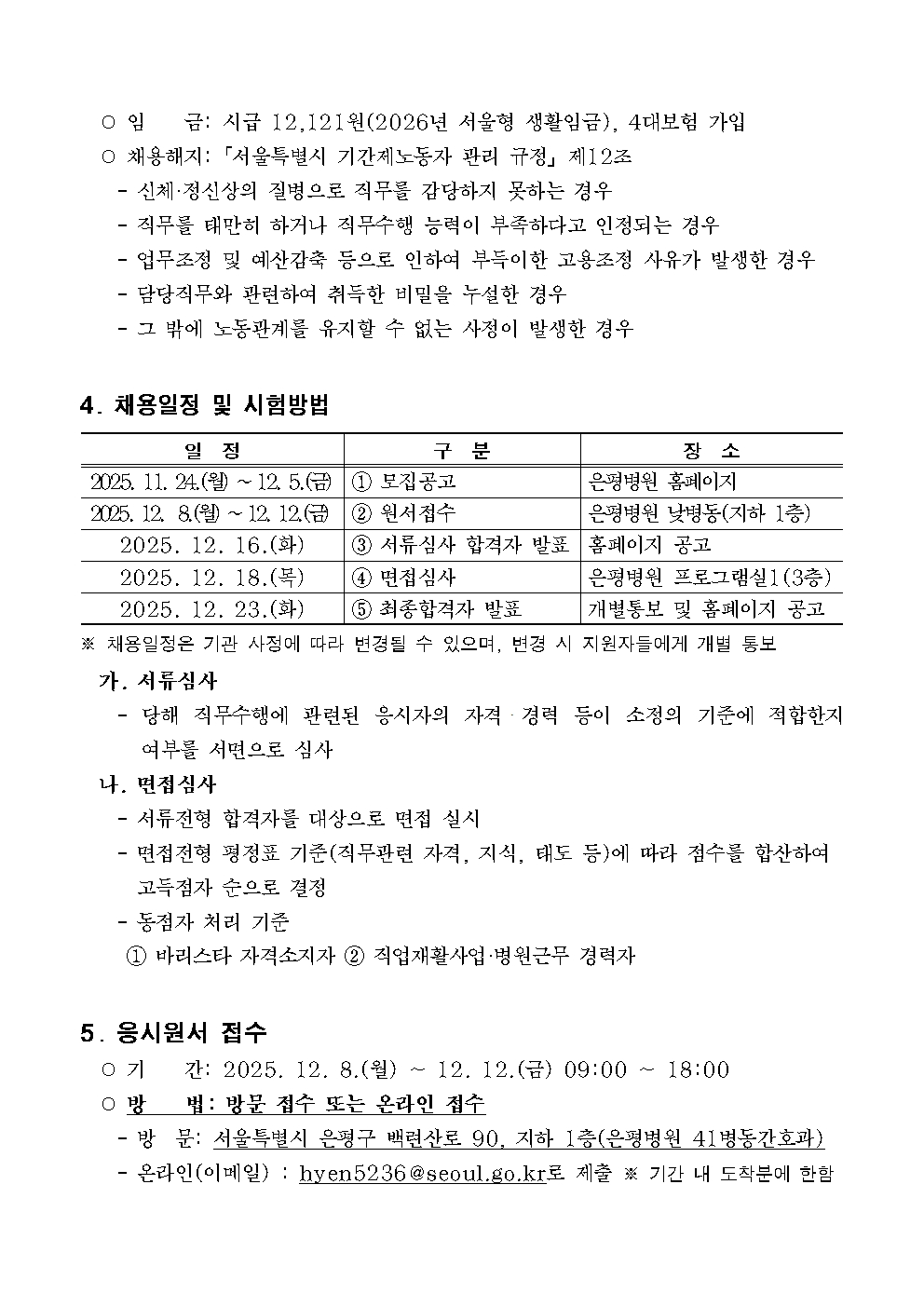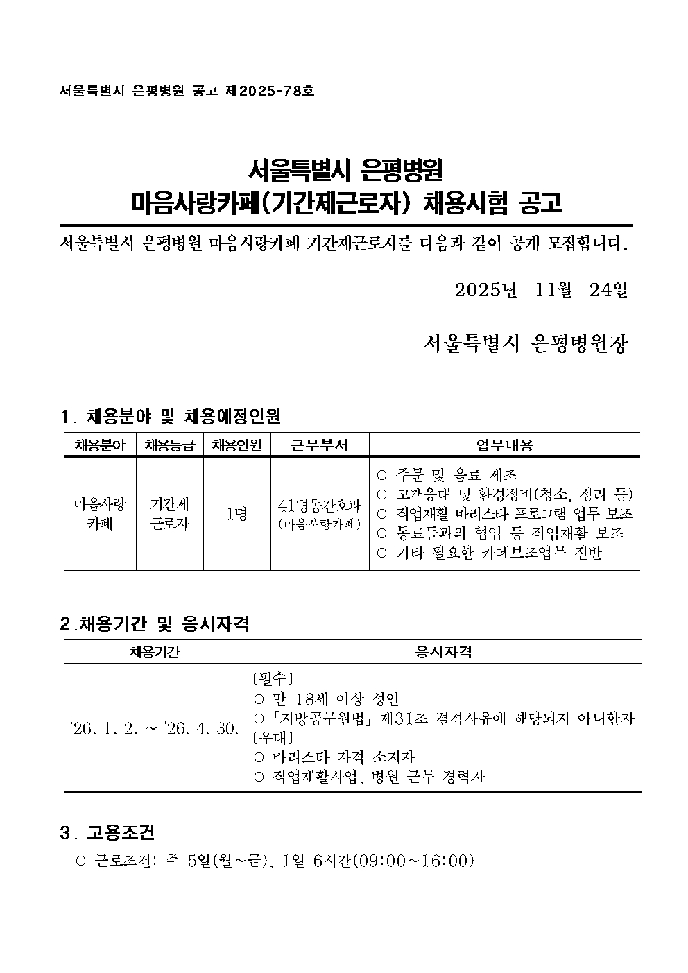 2026년 서울특별시 은평병원 마음사랑카페(기간제근로자) 채용시험 공고